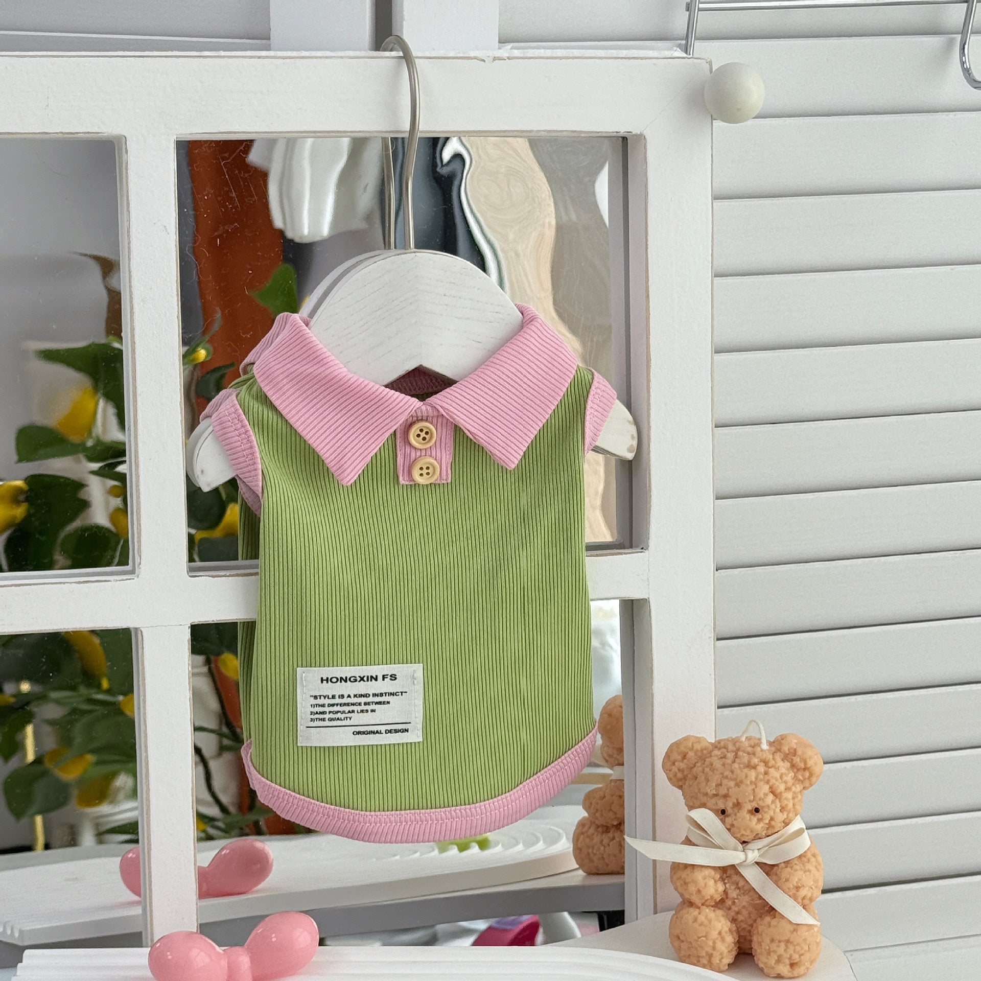 - Design: Featuring a fresh pink-green color block and a classic POLO collar, this vest exudes a vibrant preppy vibe. Vintage wooden buttons at the neckline add a refined touch, making your pet a stylish standout wherever you go.